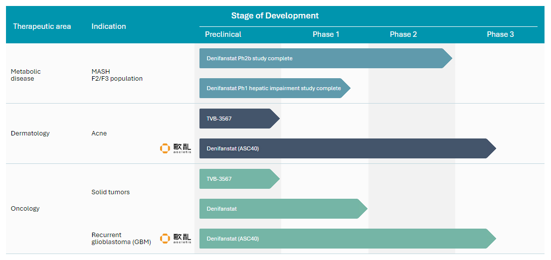 developing novel fatty acid synthase (FASN) inhibitors that are designed to treat dysfunctional metabolic and fibrotic pathways in diseases resulting from the overproduction of the fatty acid, palmitate. We are exploring the use of our FASN inhibitors, which include our lead product candidate denifanstat and our pipeline product candidate, TVB-3567, in metabolic dysfunction associated steatohepatitis (MASH), acne and select forms of cancer, disease areas in which dysregulation of fatty acid metabolism plays a key role.